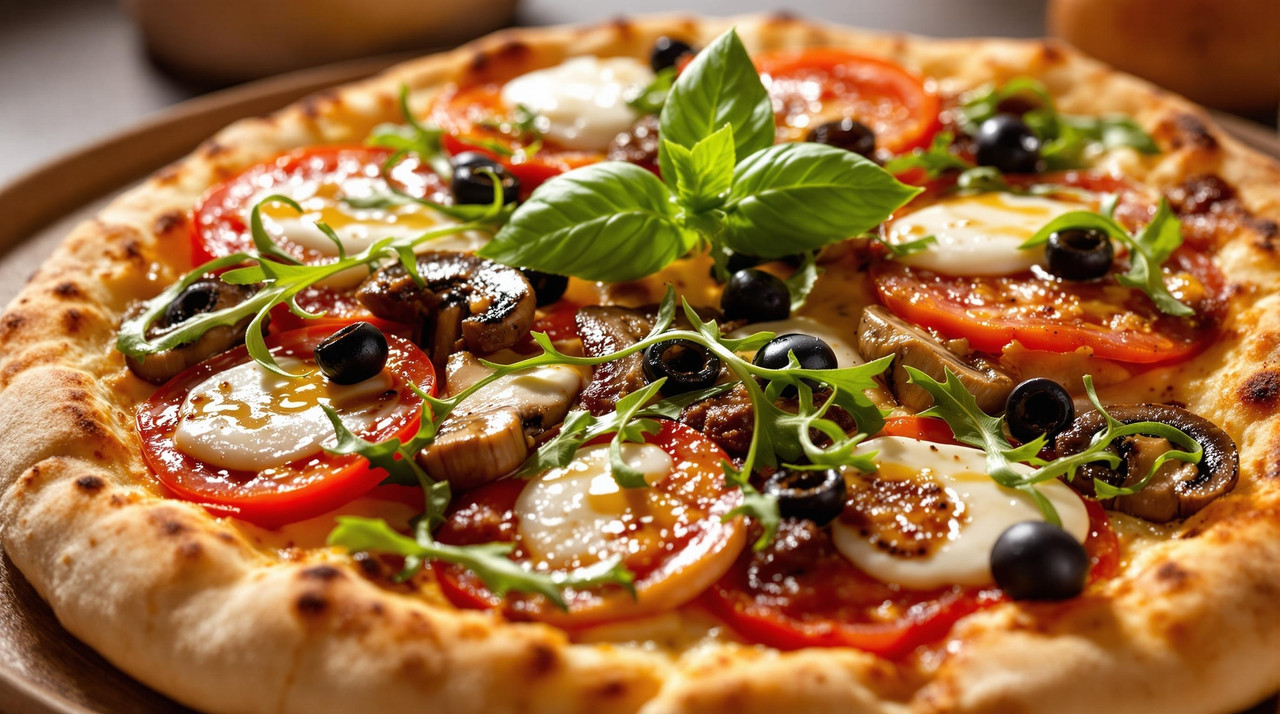 Tomate fresco, Cogumelos variados, Chouriço, Azeitona, Rucola, Mozzarella, Azeite, Manjericão