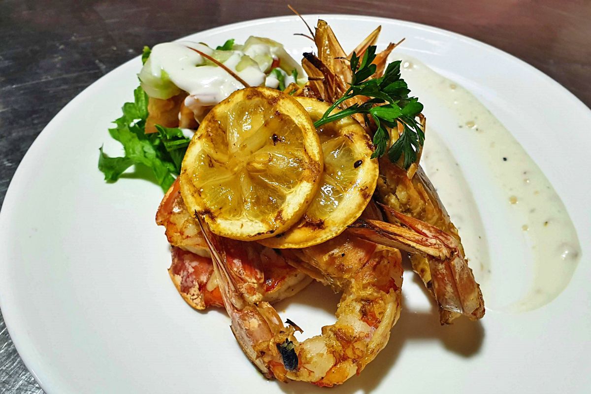 Gambas grelhadas acompanhadas de batata assada, molho de iogurte, alho e salada