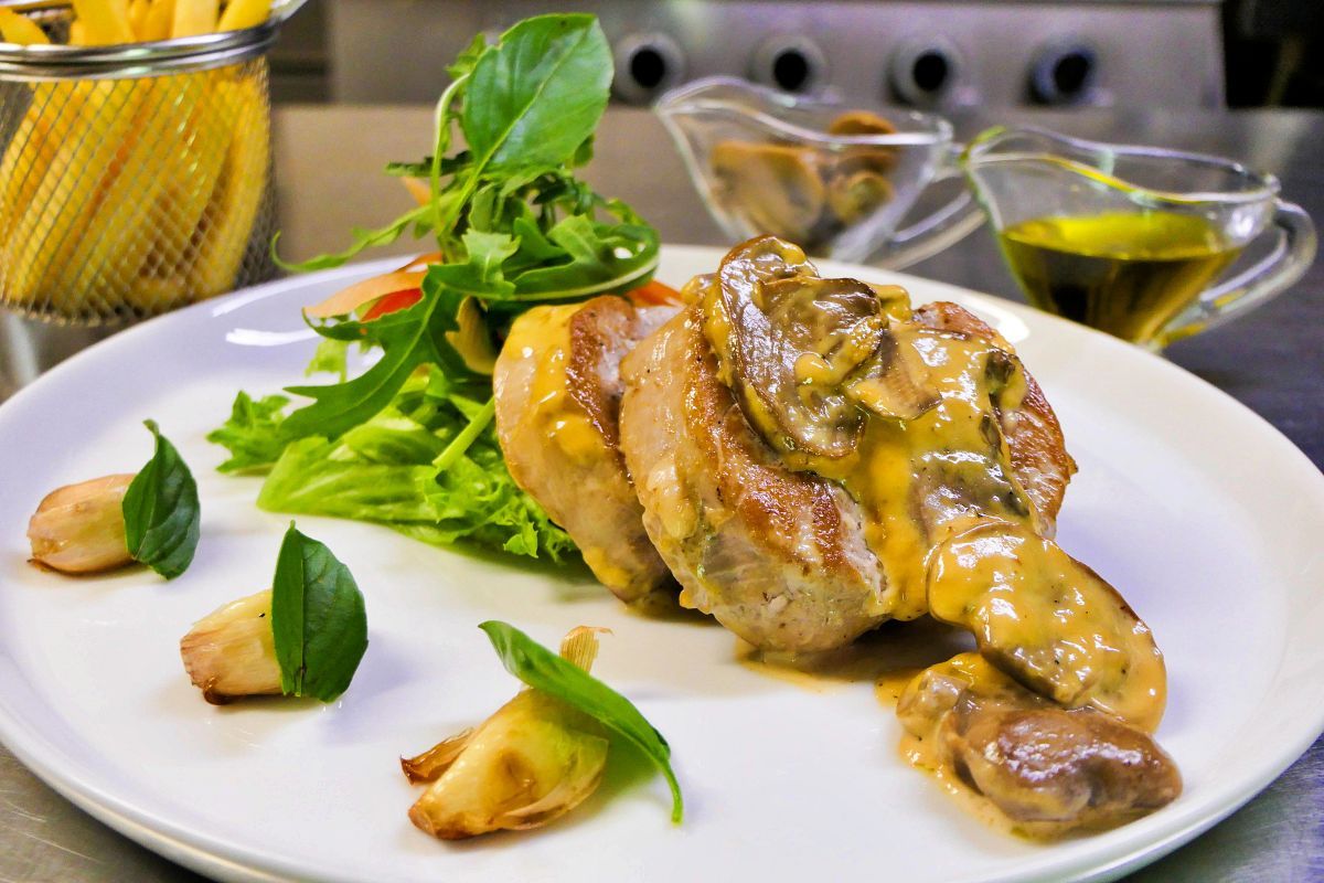 Bife de porco com molho cogumelos acompanhado de batatas palito e salada