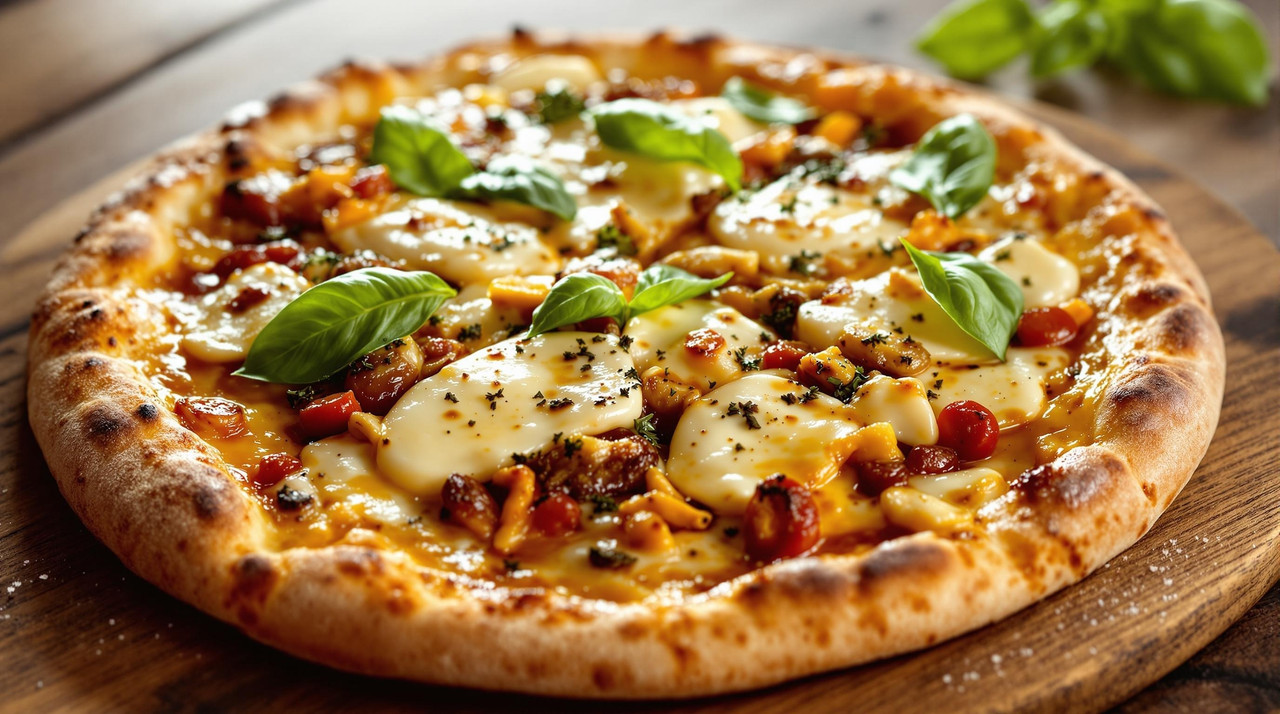Mozzarella, Rechecione, Fiambre, Cogumelos, Azeite, Manjericão